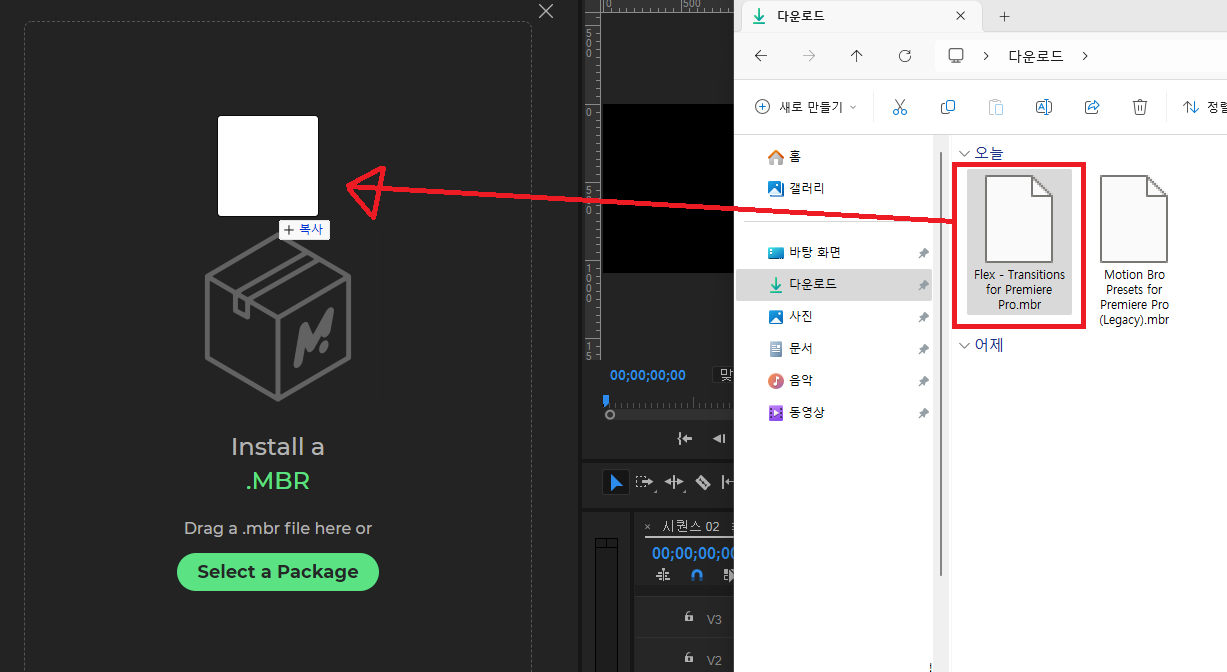 위의 방법과 동일하게 파일을 프리미어프로 모션브로에 끌어와 설치를 해주시면 됩니다.