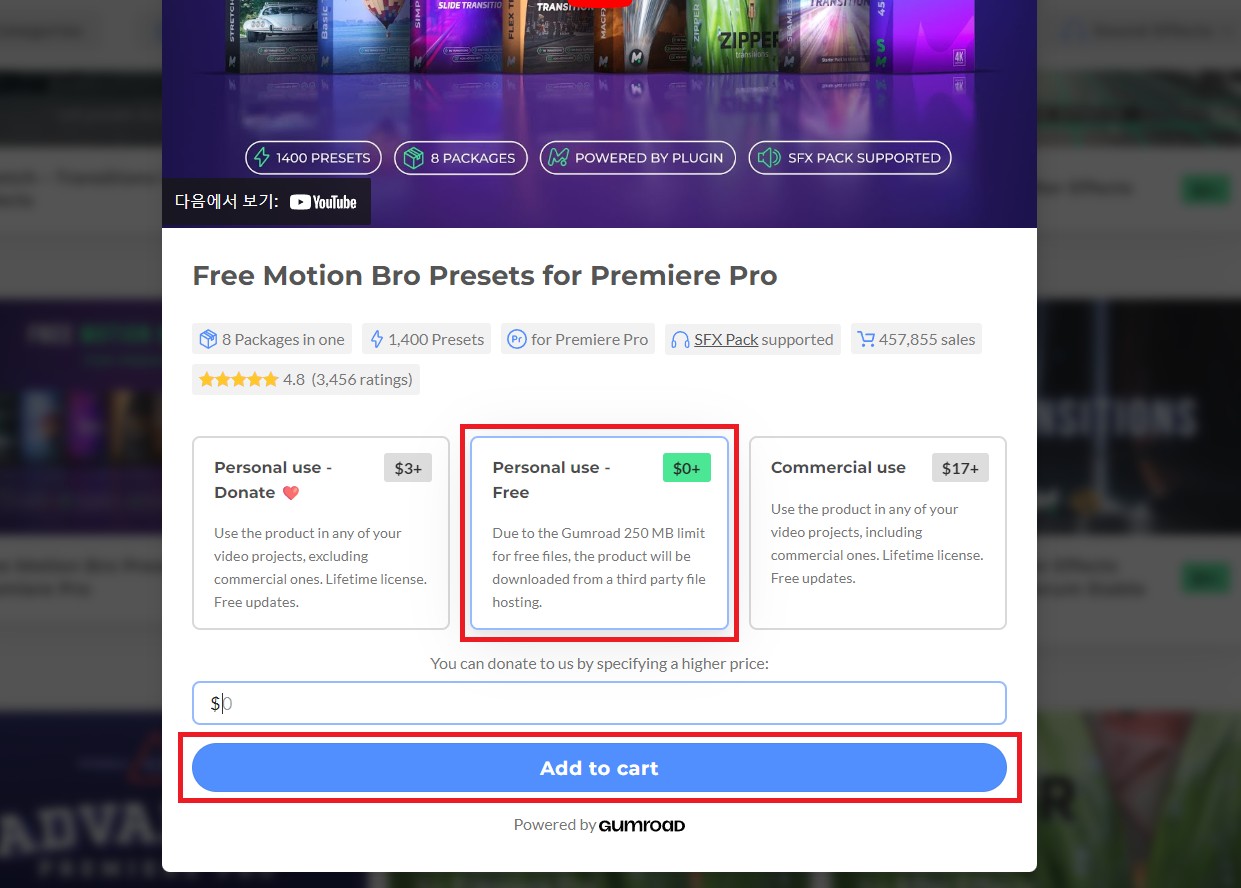 아래 화면과 같이 가격을 설정할 수 있는데 저희는 무료를 선택하고, [Add to cart]를 클릭해줍니다.